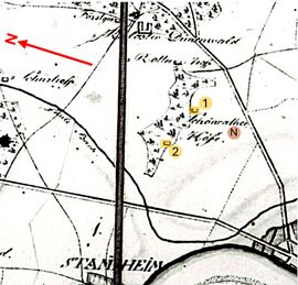 - ↑ Angezeigt z.B. auf der Deutschen Grundkarte 1949 sowie verschiedenen Luftbildkarten. Bezirksregierung Köln, Deutsche Grundkarte, Topografisches Basiswerk, Blatt 5008/01 Ausgabe Aug. 1949.