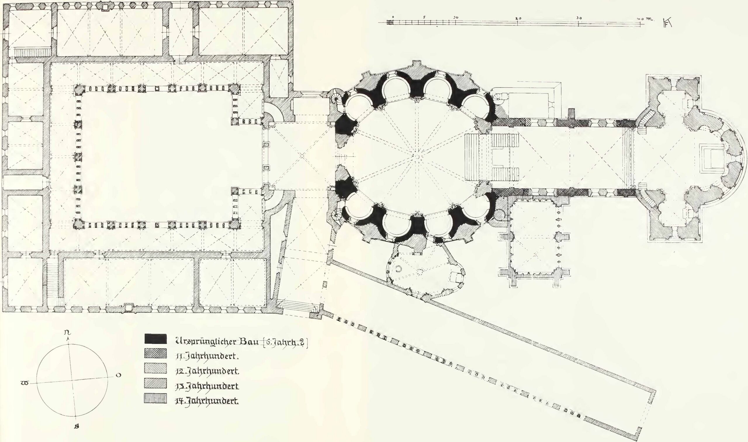 Grundriss von St. Gereon mit dem ehemaligen Stift (nach Sulpiz Boisserée) l == Quelle: Paul Clemen (Hg.): Die Kunstdenkmäler der Rheinprovinz. Bd. 7, I. Abt., Düsseldorf, 1911