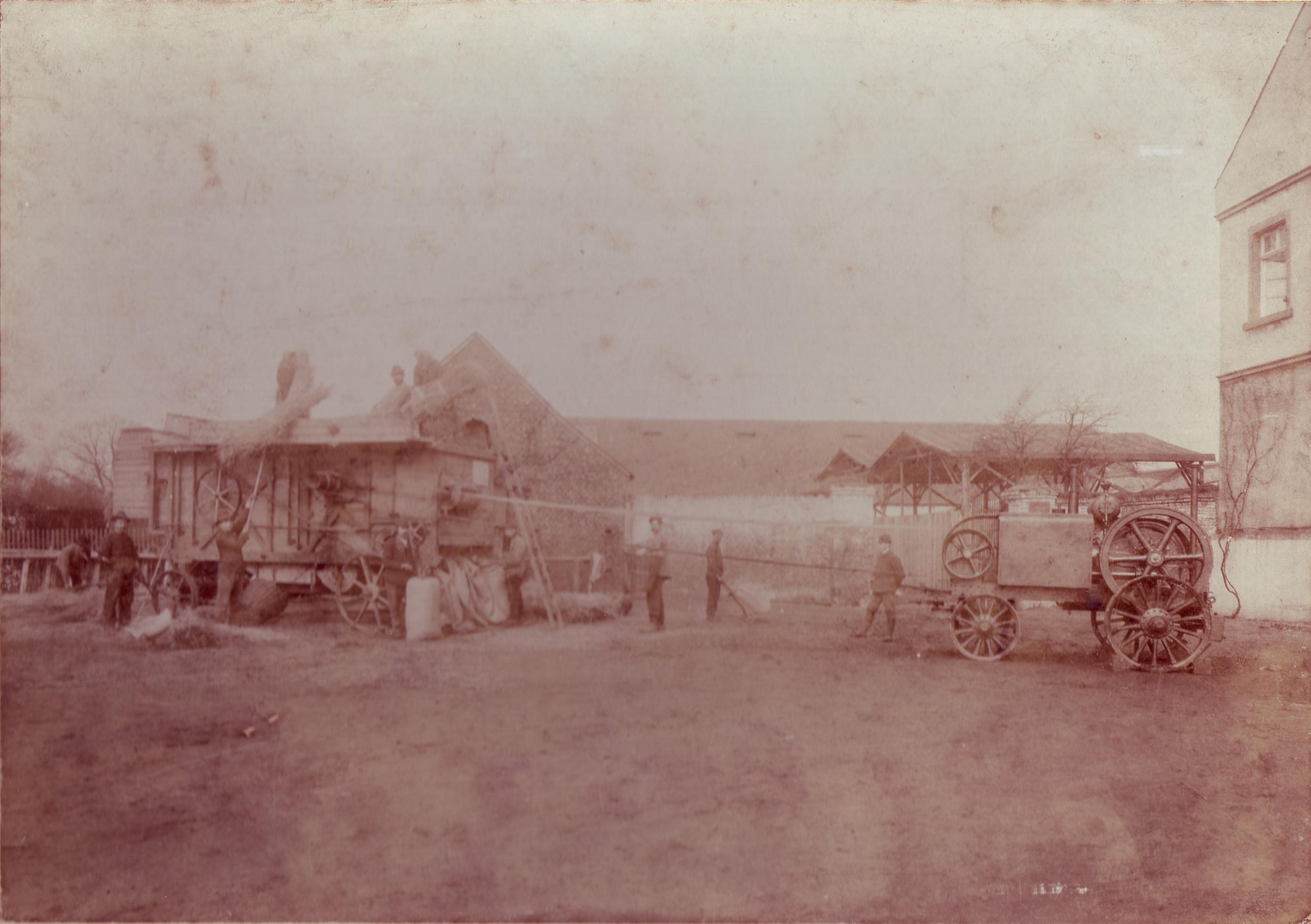 Drescharbeit in Schönrath um 1890 (Sammlung Dr. Wilfried Litz). Links: Dreschmaschine, Mitte: Energieübertragungsseile, rechts: Antriebsaggregat