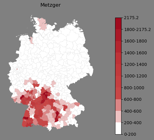 Relative Verteilung des Namens Metzger (1996)Direkt zur KarteDie Farbskala zeigt die Anzahl von "Metzger" bezogen auf je 1 Million Einträge. Besonders viele "Metzger" finden sich in den Kreisen XYZ, ZXY und ... Hier kann weiterer kurzer Text stehen. |