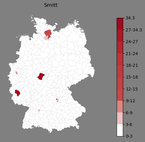 Relative Verteilung des Namens Smitt (1996)Direkt zur KarteDie Farbskala zeigt die Anzahl von "Smitt" bezogen auf je 1 Million Einträge. Besonders viele "Smitt" finden sich in den Kreisen XYZ, ZXY und ... Hier kann weiterer kurzer Text stehen. |