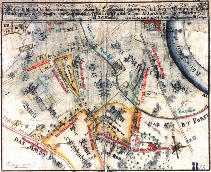 HAStK_Best. 7101 Nr. 0963/3 ergänzt durch Beschriftungen der heutigen Straßennamen. Karte ist extrem fehlerhaft und nur mit größter Vorsicht zu gebrauchen