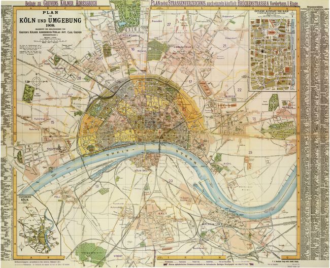 Der Plan erschien als Beilage zum Adressbuch 1909 vom Greven-Verlag. Die Verhandlungen mit der preußischen Regierung führten im Jahr 1881 zum Abriß der mittelalterlichen Stadtmauern.Durch die Erschließung der neuen Wallstraßen und den ca. 700m breiten Gürtel jenseits der Ringstraßen wurde die geplante Neustadt ausgebaut. Viele große Industrieunternehmungen hatten sich aus dem herschenden Platzmangel in der Altstadt schon in den Vororten niedergelassen (Maschinenbau und Chemieindustrie). Der Mangel an Wohnungen trieb bereits viele Arbeiter mit ihren Familien in die entstehenden Vororte.