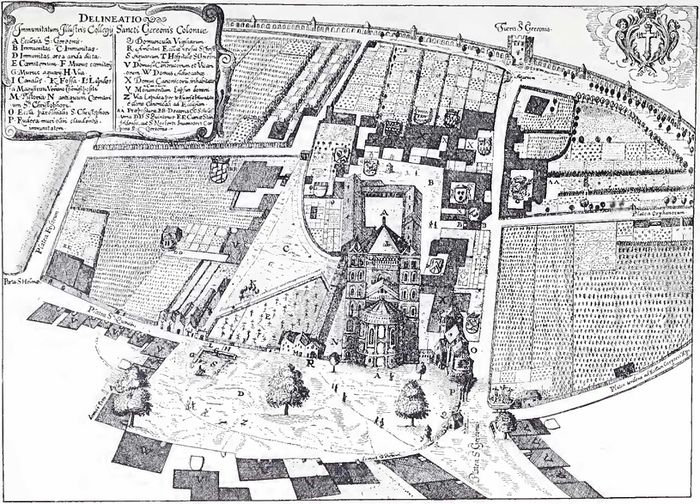 St. Gereon mit seiner Stiftanlage, Kupferstich des 17. Jh.