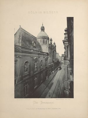 Die Synagoge an der Glockengasse wurde nach Plänen des Dombaumeisters Ernst Friedrich Zwirner als erster moderner Synagogenbau im maurischen Stil erbaut und 1861 eingeweiht. Der Repräsentationsbau stand auf dem Grundstück des früheren Klosters an der Glockengasse Nr. 5-7. Finanziert wurde das Bauvorhaben ausschließlich vom Kölner Bankier Abraham von Oppenheim. Im November 1938 wurde sie von den Nationalsozialisten zerstört. Die von dem Bildhauer und Maler Jürgen Hans Grümmer gestaltete Bronzetafel an der Fassade des Opernhauses erinnert an den früheren Standort der Synagoge in der Glockengasse 5-7 und trägt die Inschrift: