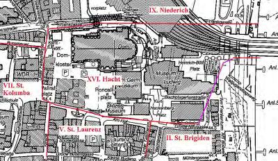 Begrenzt wurde der Bezirk im Norden durch die Trankgasse, im Westen durch Unter Fettenhennen, im Süden durch die Nordseiten von Am Hof und Große Neugasse. Im Osten verlief die Grenze hinter den Häusern der Straße Auf dem Brand, kurz vor der Probstei von St. Maria ad Gradus bog sie zum Rhein hin ab.