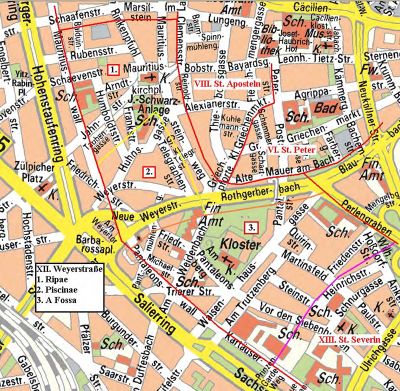 Der Bezirk erstreckt sich im Norden hinter dem Laach, Marsilstein und der Schaafenstraße. Er hat 3 Unterbezirke a Fossa (südlich Rothgerberbach und Weyerstraße), Piscinae (Weyerstraße und Huhnsgasse), Ripae (der Rest mit Rothgerberbach, Mauritiussteinweg und Rinkenpfuhl).