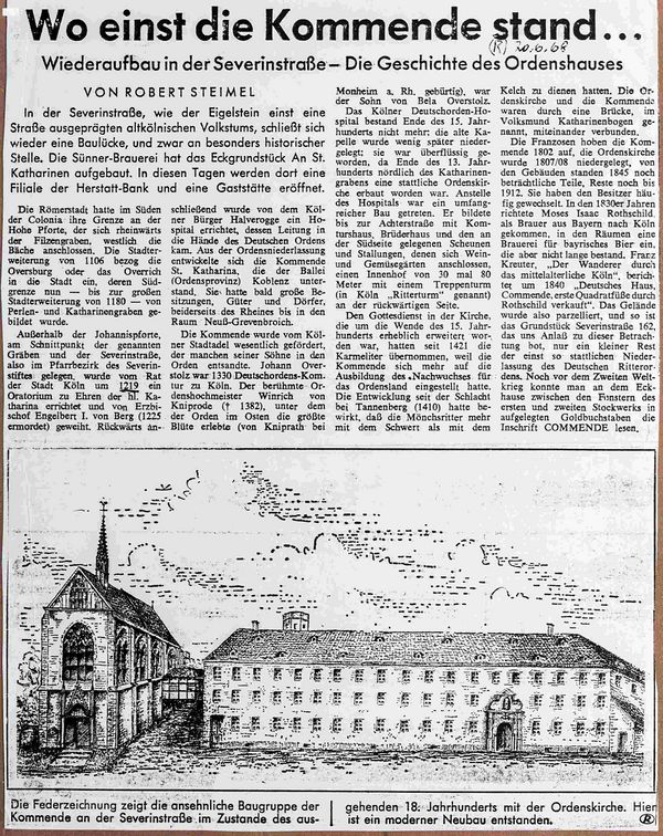 Die Deutschordenskommende St. Katharina wurde nach einem Schreiben des Rates an den Papst im Jahre 1219 ein unmittelbar vor der alten Johannispforte am Schnittpunkt des alten Wallgrabens und der Severinstraße erbautes Oratorium durch den Erzbischof Engelbert I. von Berg zu Ehren der h. Katharina geweiht und anschließend an das Bethaus von dem Kölner Bürger Heinrich Halverogge für den Ordensdienst ein Hospital errichtet.