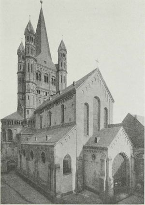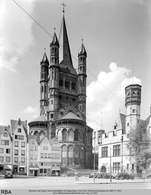 Gründung der Kirche für die Vorstadt zwischen Rhein und Römermauer 963-965. das mit ihr verbundene Stift wurde in ein Benediktinerkloster umgewandelt und mit Schottenmönchen besetzt. 1150 Zerstörung durch den großen Stadtbrand. Neubau 1172 der aber auch schon 1185 wieder einem Brand zum Opfer fiel. Danach wieder großer Neubau in heutiger Gestalt.