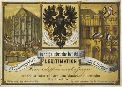In Anwesenheit des Prinzregenten Wilhelm wird die erste feste Rheinbrücke seit der Römerzeit in Betrieb genommen. Es waren die Eisenbahngesellschaften, die sich für den Bau eingesetzt hatten, um das lästige Umsteigen der Fahrgäste zwecks Rheinüberquerung abzuschaffen. Der Grundstein wurde am 3. Oktober 1855 gelegt und nach 4 Jahren Bauzeit war die Brücke fertiggestellt.