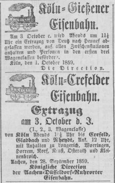 Am Tag der Einweihung dürfte ganz Köln auf den Beinen gewesen sein: Sonderfahrten der Eisenbahngesellschaften und der Schiffsunternehmen, unzählige Sonderaktionen in den Restaurants und Tanzlokalen, Feuerwerke und Beleuchtungen am Abend. Einige Zeitungsanzeigen mögen dies veranschaulichen.