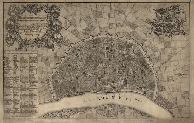 Die Hauptstraßen sind mit Namen versehen. Ein Verzeichnis der "Fürnehmsten" Gebäude, Pforten, Kirchen, Schreinsbezirke usw. ist beigefügt.