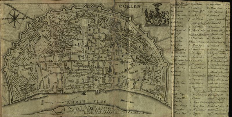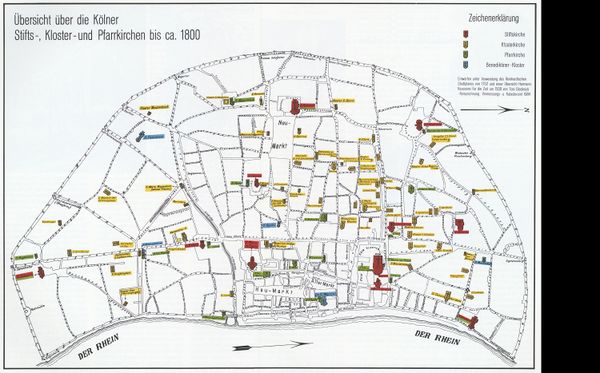Bis zur Aufhebung der meisten Kirchen und Klöster im Jahre 1802 (Säkularisierung) befanden sich in Köln 116 Kirchen und dem öffentlichen Gottesdienste geweihte Kapellen, nämlich 11 Stiftskirchen, wovon drei zugleich Pfarrkirchen waren, als St. Severin, St. Aposteln und St. Cunibert. 16 Pfarrkirchen, unter welchen St. Columba die Hauptpfarre war, 5 Ordens- und 12 Mönchsklöster, wozu wir das Jesuiten Collegium zählen; ferner 2 Abteien, 37 Nonnenklöster und 33 Kapellen, von welchen überhaupt bei der Aufhebung, vierzig dem öffentlichen Gottesdienste gewidmet blieben, und 76, deren Vermögen man auf 200 Millionen Gulden, und die Zahl der geistlichen Personen beiderlei Geschlechts auf 2500 schätzte, eingingen, wodurch sich die Sage, als habe Köln so viele Kirchen als Tage im Jahre - nämlich 365 gehabt - von selbst widerlegt.[2]