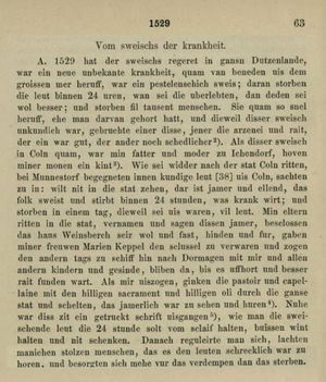 Anno 1529 schreibt Weinsberg über eine furchtbare Seuche, die auch in Köln Einzug hält und viele Opfer fordert: Der "Englische Schweiß" wütet grausamer als die Pest - die Erkrankten, vor allem junge, kräftige Männer, sterben binnen weniger Stunden.