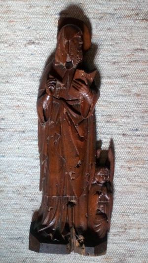 Die Figur, die bis zur Zerstörung der Kirche im Jahre 1944 Bestandteil der Ausschmückung des Chorraums war, lag auf einem Berg Holz und sollte verfeuert werden. Mein Großvater, Maler und Anstreicher, hat sie sich als Bezahlung erbeten für Material, womit Räumlichkeiten der Pfarre nach Kriegsschäden renoviert wurden. (A. Heffen)