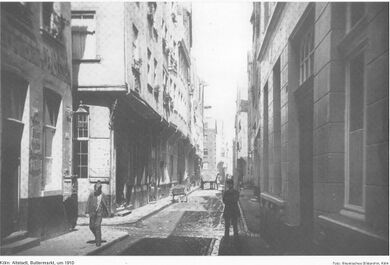 In Fortsetzung des Thurnmarktes und des Knitmarktes am Rheinufer zieht sich eine schmale und eng bebaute Gasse als Bottermarckt hin. Hier hatten die Butterverkäufer ihre Stände aufgebaut.