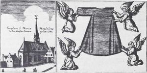 Weißfrauenkloster von Osten und sein heiliger Rock, Kupferstich, um 1700
