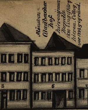Anmerkung: Diese Beschriftung von Keussen ist nicht korrekt, da die "Kronenburse" (Haus Nr. 10) und der Gladbacher Hof mit der Hieronymuskapelle (Haus Nr. 6) nicht identisch sind