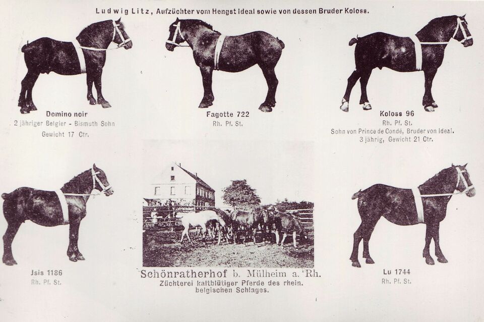 Werbekarte von Ludwig Litz für Kaltblüter, die auf Schönrath gezüchtet wurden