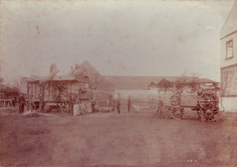 Drescharbeit in Schönrath um 1890. Links Dreschmaschine, rechts Antriebsaggregat, in der Mitte Energieübertragungsseile