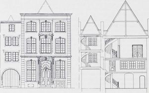 Schöne Fassade aus der Mitte des 18. Jh., mit Mittelrisalit und masken- geschmücktem Portal (vgl. Heumarkt 50 u. Severinstr. 218), daneben eine ältere rundbogige Einfahrt, Fig. 296. Im Hause Stuckbalkendecken aus dem Ende des 16. u. 17. und flache Stuckdecke aus dem Anf. des 18. Jh. (im Zwischengeschoß über der Durchfahrt mit Akanthuswerk, der Jahresz. 1712 und Doppelwappen, in dem einen Schild das Lamm Gottes, in dem anderen eine Taube). Im Obergeschoß eine Kaminnische im Stil Ludwigs XVI.[1]