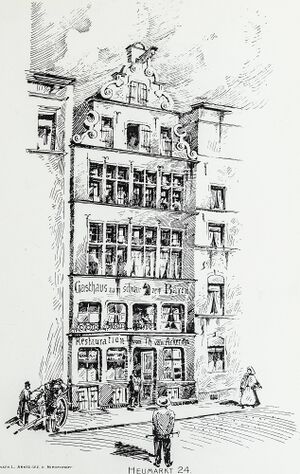Heumarkt 20 (früher 24, z. großen und kleinen Bär, z. schwarzen Bär): Haus z- Bär Lau , Buch Weinsberg, IV, S. 169. — Aus dem alten Köln, III, 5. — Lübke, Deutsche Renaissance, II, S. 459. — Keussen , Topogr. I, Sp. 29b. — Dehio , V, S. 295. — Bleistiftzg. v. De Noel, um 1840, Hist. Mus. A I 3/487 [989]. — Bleistiftzg. um 1880 v. Karl Kauf. — Bleistiftzg. v. L. Arntz, 1895, Denkmalsarchiv Bonn 4404. — Maßstäbl. Aufn. v. Gust. Krause, wie bei Nr. 16. Fig. 294.