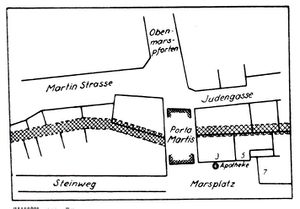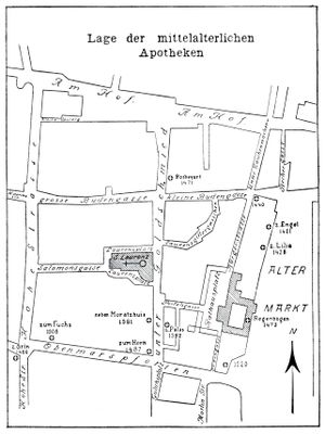 Die älteste bekannte Apotheke in Köln lag am Marsplatz, dort wo an der Stadtmauer am Ende von Oben Marspforten ein altes römisches Stadttor, die porta Martis stand. In den Häusern neben der Porta sind über Jahrhunderte (bis 1612) Apotheker in mehreren Generationen aus einigen Familien überliefert. Der Marsplatz lag zwischen Heumarkt und Alter Markt im Brennpunkt des mittelalterlichen Geschäftslebens.