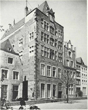 Hinterhausgiebel zur Faßbindergasse mit Übereckfialen in Backsteintechnik aus derselben Zeit, einziges bekanntes Kölner Beispiel, in schlechtem Bau­ zustande (Anheisser , T. 24). Im Hinterhause Stuckdecke mit Akanthusranken, darunter spätgotische Deckenmalerei des 15. oder 16. Jh. (Zg. v. Rodewald, 1912, beim städt. Konservator.) [2]